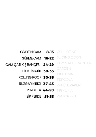 GİYOTİN CAM 8-15 GUILLOTINE SÜRME CAM 16-22 SLIDING DOOR CAM ÇATI KIŞ BAHÇESİ 24-29 GLASS ROOF WINTER GARDEN BİOKLİMATİK 30-35 BIOCLIMATIC ROLLING ROOF 30-35 PERGOLA RÜZGAR KIRICI 37-43 WIND BRAKER PERGOLA 44-50 PERGOLA ZİP PERDE 51-53 ZIP SCREEN